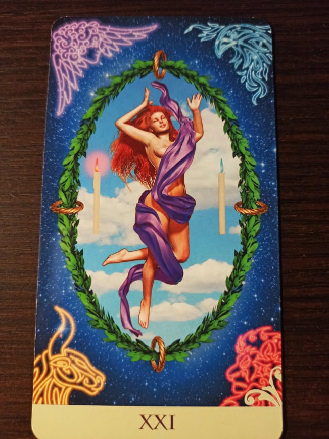 The key concept for the World card is completion. It is the last card in the Major Arcana. The four divine beings are brought together to witness that a cycle has reached its conclusion. The dancer evokes the joy of the yogini from the Death card (Major Arcana 13), and her pose evokes the spiritual surrender of the Hanged Man. Life has triumphed, the soul is renewed. Take a victory lap and get ready to start the next cycle.