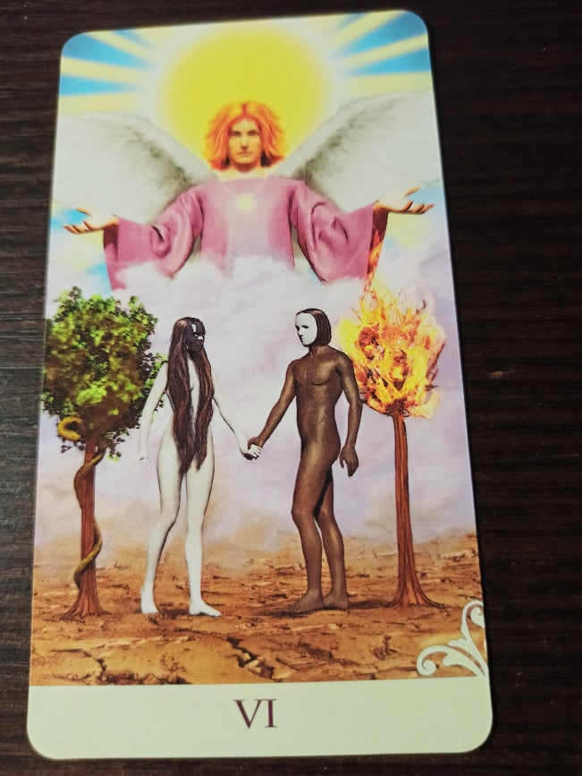 While this card does indicates a significant relationship, the symbols emphasize the idea of choice and of seeing things through another’s eyes while making that choice. The Lovers step toward each other across the hot, cracked ground. If you are faced with a choice, know that it will be easier if your significant other understands and supports that decision. If that doesn’t fit for you, have an internal dialogue with your shadow self to gain clarity about your choices.
