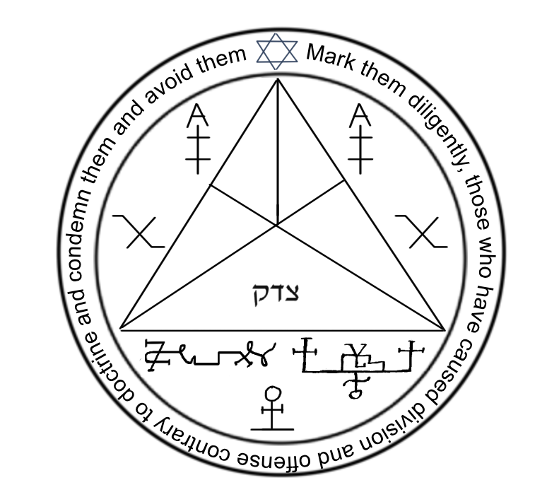 The circle says "Mark them diligently, those who have caused division and offense contrary to doctrine and condemn them and avoid themâ