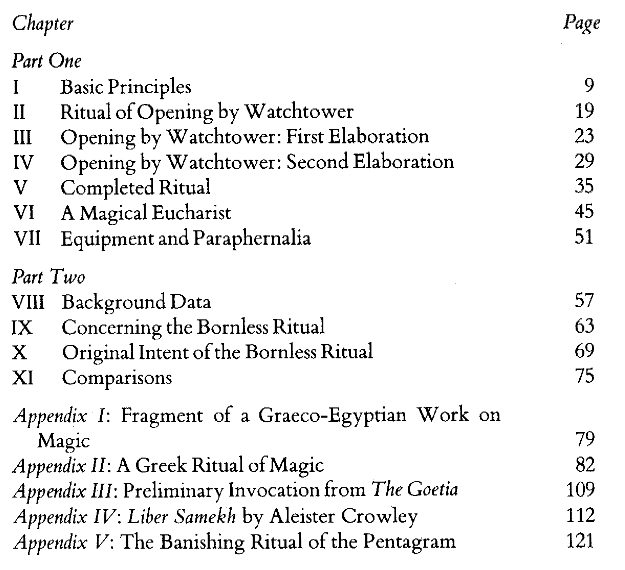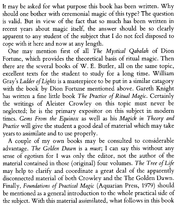 From Israel Regardie’s book, Ceremonial Magick: A Guide to the Mechanisms of Ritual, which has the chapters listed below. In the beginning he lists a number of classics that he considers a basic but comprehensive course in Kabbalistic-style high magick, which I share here.