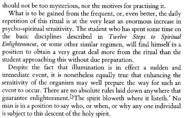 I just got through listening to this in audiobook version. Very apropos for becoming a living god. The last chapters reiterate the old hermetic maxim - know yourself and approach the work without ego but with love, and then it flows.
